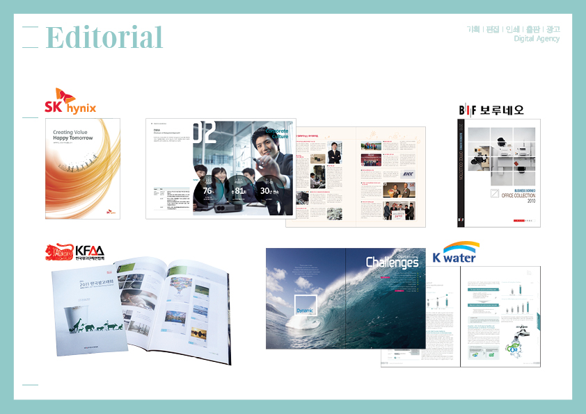 지속가능경영보고서(SR, AR,CSR등), 브로슈어, 카탈로그, 사보, 월간지, 매뉴얼, 포스터, CI & BI, 북디자인, 패키지, 주보디자인에서 인쇄까지…
